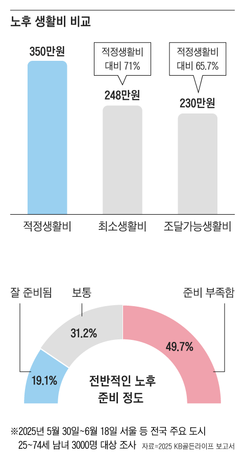 출처: 조선일보, 「노후 적정 생활비 월 350만원, 현실은 120만원 모자란다」 (2025.09.29), KB금융 경영연구소 ‘KB골든라이프 보고서’ 인용.
