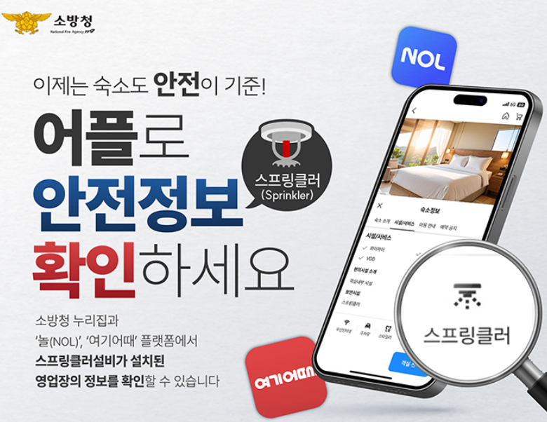 숙박시설을 예약할 때 가장 중요한 요소 중 하나는 바로 ‘안전’입니다. 특히 화재 발생 시 초기 대응이 가능한 스프링클러설비는 생명을 지키는 핵심 장치입니다. 2025년 8월부터 소방청은 민간 숙박 예약 플랫폼 **‘놀(NOL)’**과 **‘여기어때’**와 협력해, 숙박시설의 스프링클러 설치 여부를 예약 단계에서 확인할 수 있는 서비스를 제공하고 있습니다.