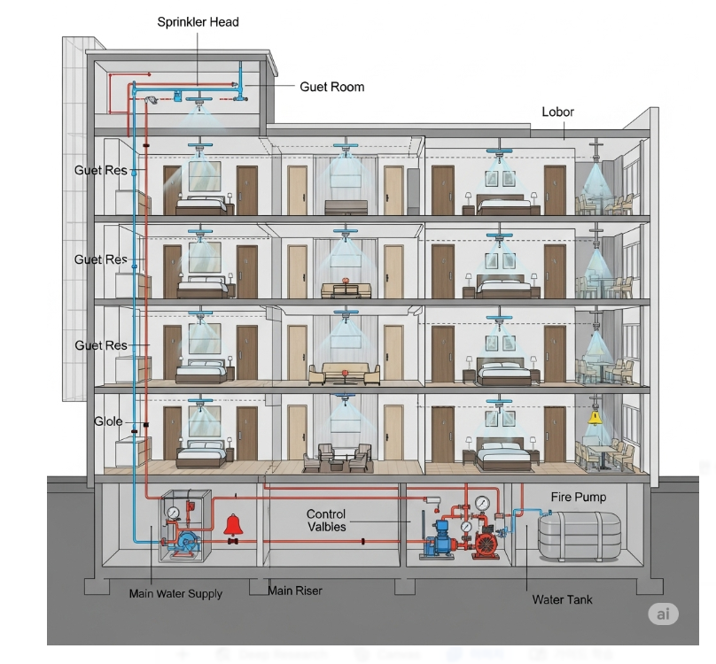이는 숙박시설의 구조적 특성(밀폐된 공간, 다수 인원 숙박)과 야간 발생 빈도가 높다는 점이 주요 원인입니다. 스프링클러는 이런 환경에서 피해를 줄일 수 있는 결정적인 장치입니다.