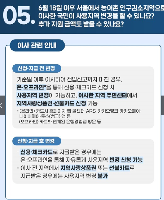 - 사용 지역 변경: 온·오프라인을 통해 신용·체크카드로 신청할 경우 사용 지역 변경이 가능하며, 이사한 지역 주민센터에서 지역사랑상품권·선불카드 신청도 가능합니다.