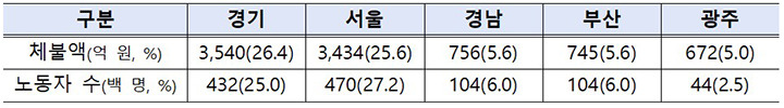 수도권 집중 현상 뚜렷…경기·서울 체불 규모 압도적