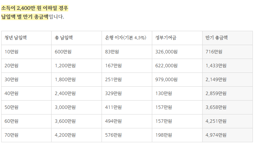 - 월 최대 70만 원씩 5년간 저축 → 정부기여금 + 이자 포함 최대 약 5,000만 원 수령 가능