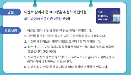 이번 기회에 청소년증을 발급하고, 편의점 상품권도 받아보세요! 신분증과 혜택, 이벤트를 한 번에 누릴 수 있는 절호의 찬스입니다.