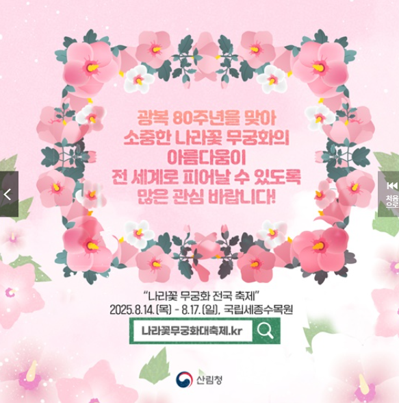 2025년 8월 14일~17일, 국립세종수목원에서 나라꽃 무궁화 전국 축제가 열립니다. 이 축제에서는 전국 각지의 무궁화 품종 전시, 무궁화 사진전, 체험 프로그램, 문화 공연 등이 진행되어 무궁화의 아름다움을 국내외에 널리 알릴 예정입니다.