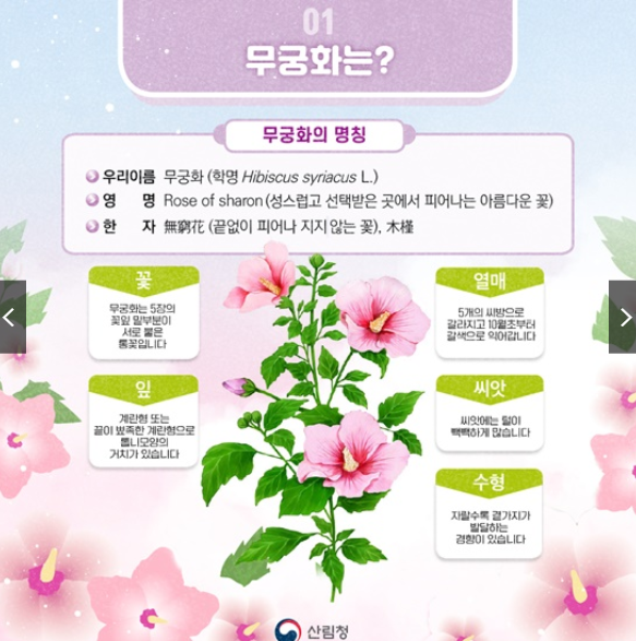 무궁화는 예로부터 ‘근화향(槿花鄕)’이라 불리며, 우리나라를 대표하는 꽃으로 알려져 있습니다. 고대 중국의 지리서 『산해경』에도 무궁화가 많은 땅으로 기록되어 있습니다.