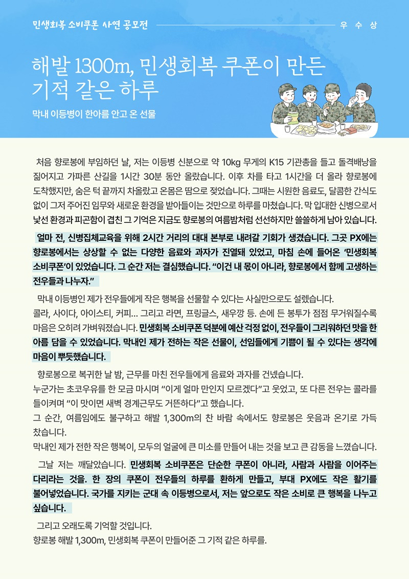 그날 저는 깨달았습니다. 민생회복 소비쿠폰은 단순한 쿠폰이 아니라, 사람과 사람을 이어주는 다리라는 것을. 한 장의 쿠폰이 전우들의 하루를 환하게 만들고, 부대 PX에도 작은 활기를 불어넣었습니다. 국가를 지키는 군대 속 이등병으로서, 저는 앞으로도 작은 소비로 큰 행복을 나누고 싶습니다.