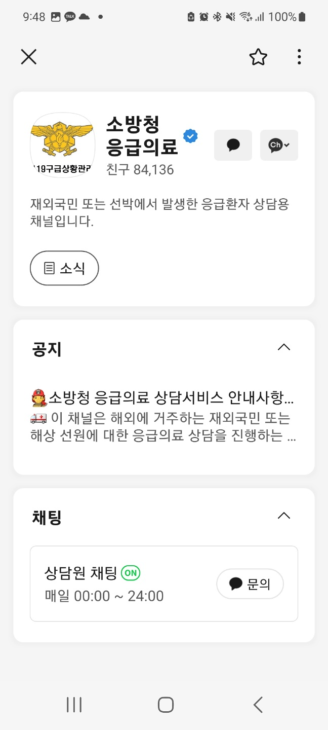 - 채팅을 통해 본인의 증상, 발생 경위, 현재 위치(국가 및 도시, 가능하다면 구체적인 장소) 등을 상세하게 설명합니다. 한국 소방청의 전문 의료진이 365일 24시간 실시간으로 상담에 응대합니다.
