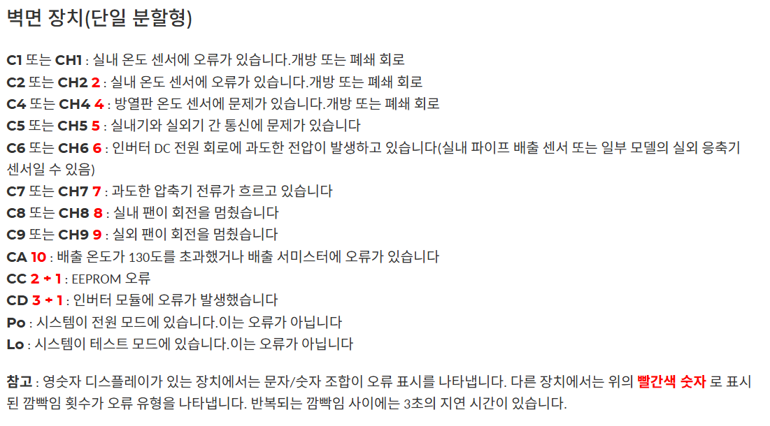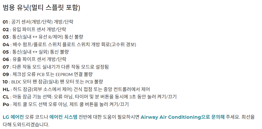 휘센 에어컨 에러코드 조치 방법 요약