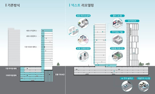 | 특징 | 철거 없이 골조 유지, 스마트 리모델링 | 공용·세대 리뉴얼, 살면서 수선 가능 |