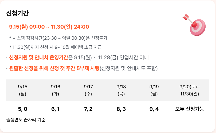 - 신청 첫 주에는 출생연도 끝자리 기준 5부제가 적용되며, 9월 20일부터는 자유롭게 신청 가능합니다.