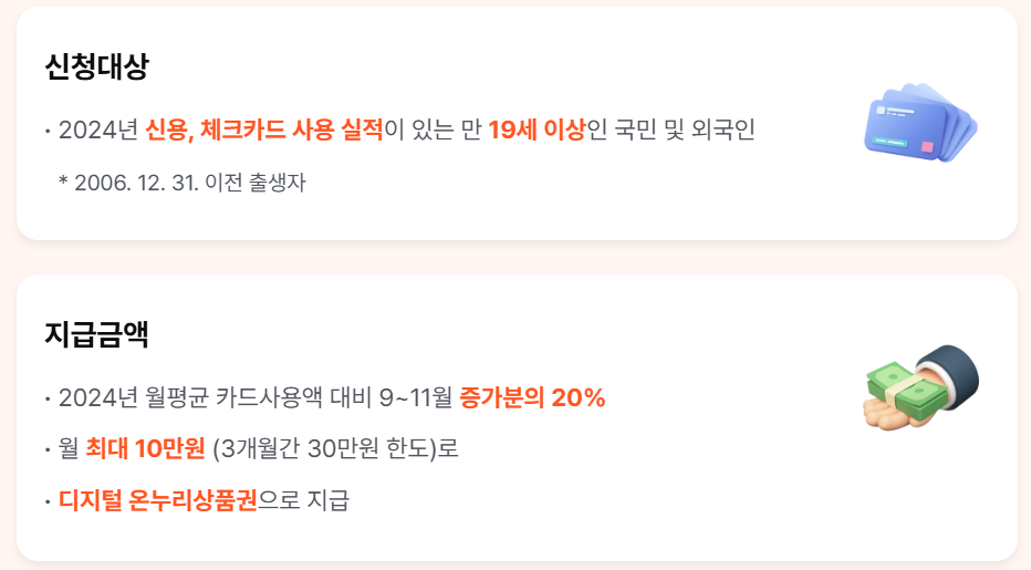 - 신청 자격은 **만 19세 이상(2006년 12월 31일 이전 출생)**으로 지난해 신용·체크카드 소비 실적이 있는 국민과 외국인 등록증을 소지한 외국인입니다.