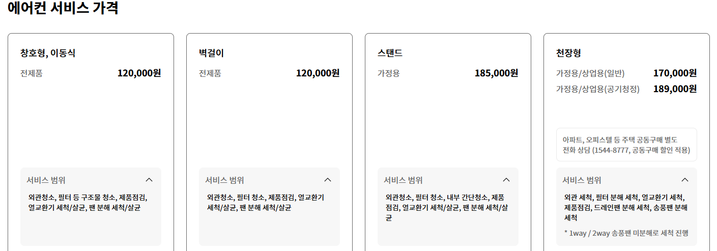 | 벽걸이형 | 전제품 | 120,000원 | 외관·필터·열교환기·팬 세척 |